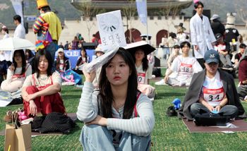Participants zone out during the Space-out Competition at Gwanghwamun Square in Jongno District, central Seoul, on April 14.