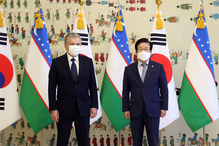 President of Uzbekistan Shavkat Mirziyoyev, left, meets with National Assembly speaker Park Byeong-seug, at the Assembly in western Seoul on Friday. The two leaders discussed cooperation in global supply chains and rare metal trading, amongst...